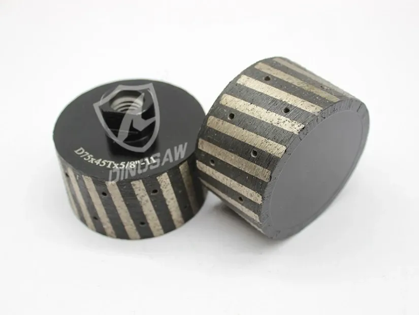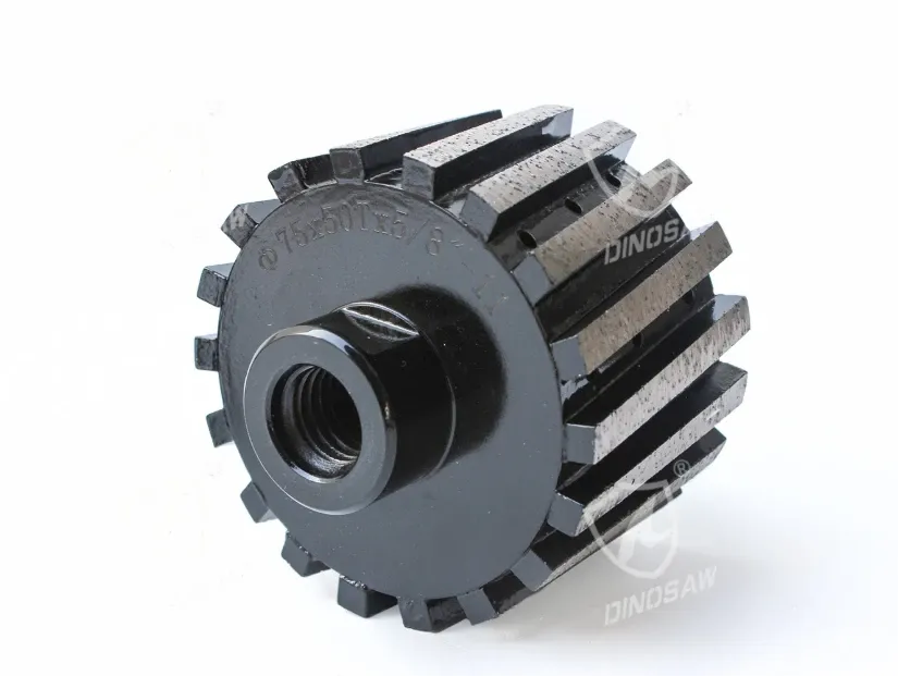 Cut manual grinding and repair work. The drum profile cleans saw marks and waviness around the full perimeter.