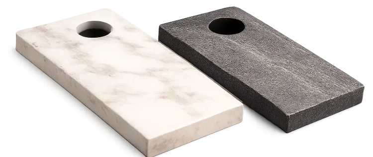 • Material (granite/quartz/marble/quartzite) + hardness notes