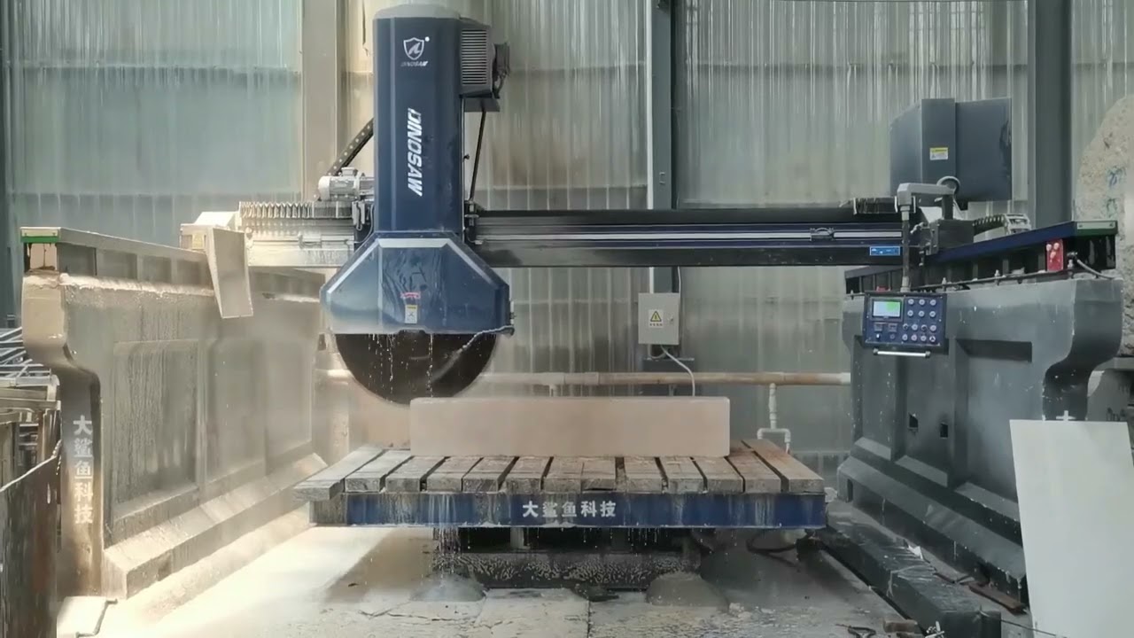 大鲨鱼CNC桥切机可高效切割花岗岩、大理石、人造石、陶瓷砖及天然石材。专用金刚石锯片与优化切割参数,支持最大280mm厚度高精度加工。